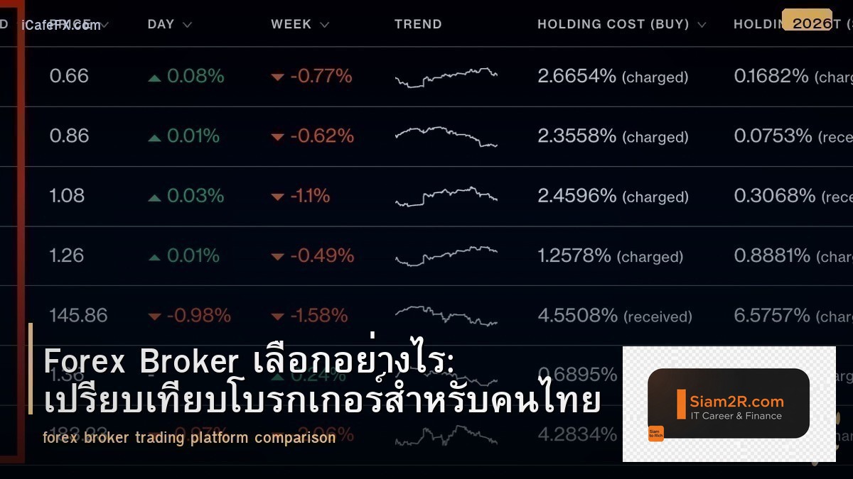 ในปี 2026 มี Forex Broker ให้เลือกมากมาย ทั้ง broker ระดับโลกและ broker ที่เน้นตลาดเอเชีย แต่ละรายมี features, ค่าธรรมเนียม และ regulation ต่างกัน สำหรับคนไทย ต้องพิจารณาเพิ่มเติมเรื่อง การฝากถอนด้วยบัญชีธนาคารไทย customer support ภาษาไทย และ payment methods ที่สะดวก