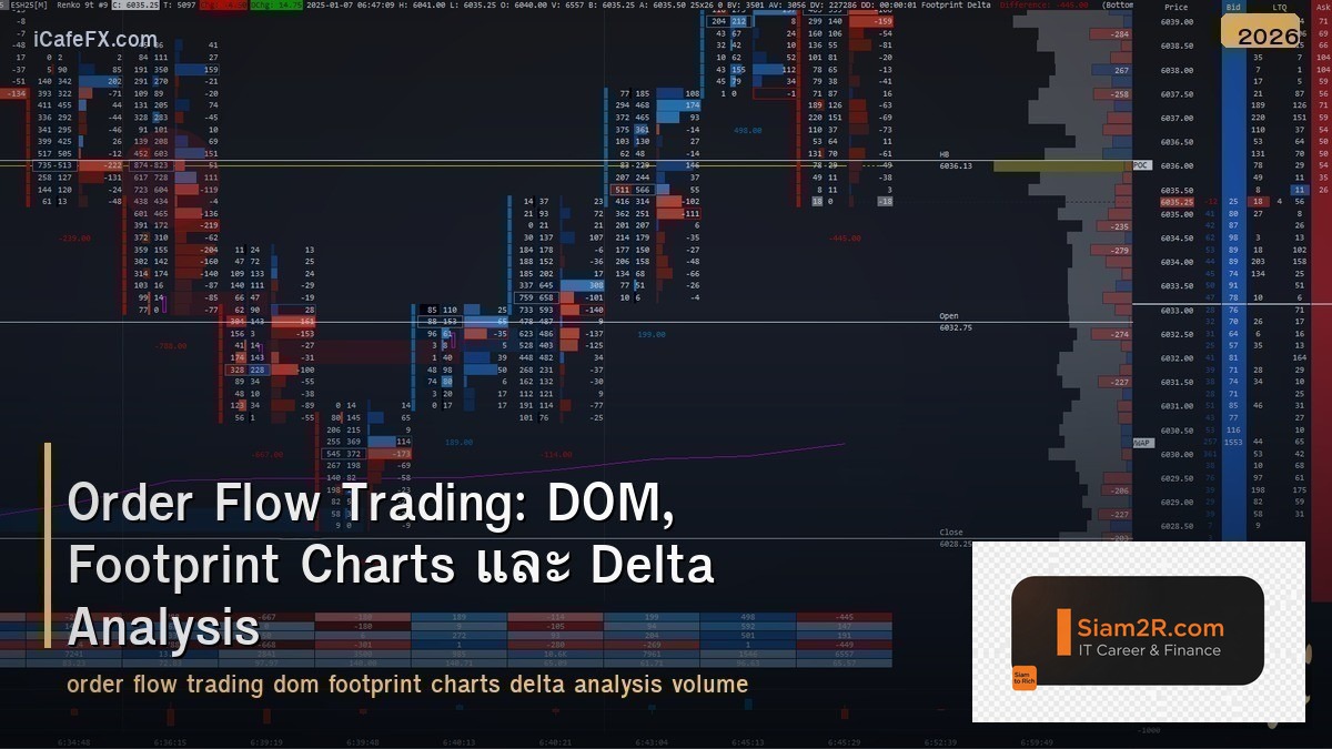 Order Flow Trading: DOM, Footprint Charts และ Delta Analysis เป็นเทคนิค/แนวคิดสำหรับการเทรดที่ช่วยให้วิเคราะห์ตลาดได้แม่นยำขึ้น สามารถนำไปใช้กับ Forex, ทองคำ XAU/USD, Crypto และ CFD ต่างๆ ได้