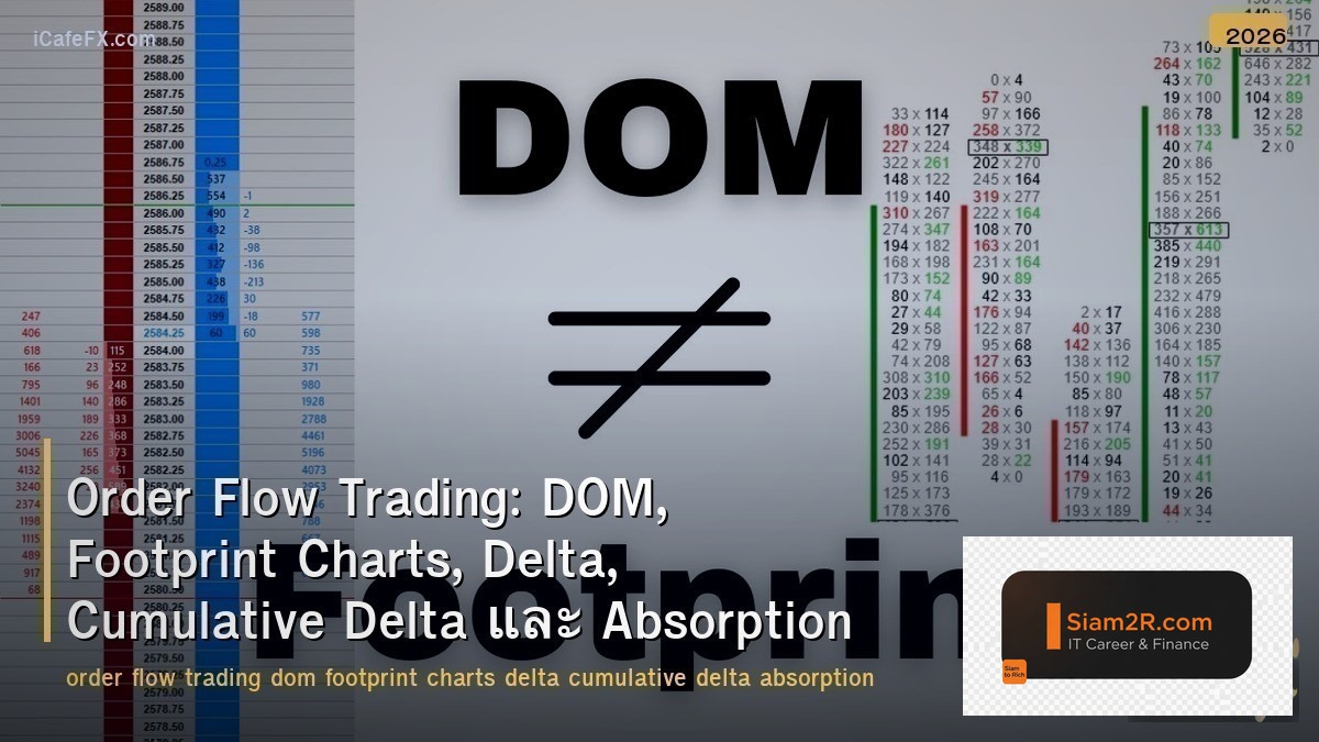 Order Flow Trading: DOM, Footprint Charts, Delta, Cumulative Delta และ Absorption เป็นเทคนิค/แนวคิดสำหรับการเทรดที่ช่วยให้วิเคราะห์ตลาดได้แม่นยำขึ้น สามารถนำไปใช้กับ Forex, ทองคำ XAU/USD, Crypto และ CFD ต่างๆ ได้